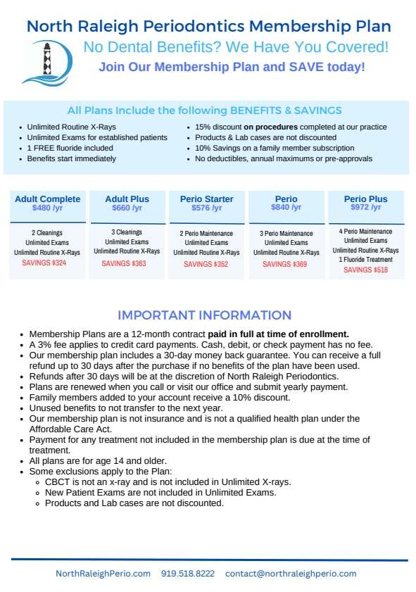 Below is an overview of the plans available to our patients and their families. This plan is an excellent option for our patients because there are NO deductibles, NO annual benefit maximums, and NO pre-approvals or exclusions. If you have any questions, please call us at (919) 518-8222 and we will be happy to answer your questions.
